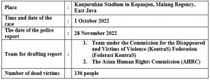 The Asian Human Rights Commission (AHRC) and the Federation of the Commission for the Disappeared and Victims of Violence (FEDERASI KontraS) wish to inform you about Preliminary Report on Monitoring and Investigation of the Kanjuruhan Stadium Case