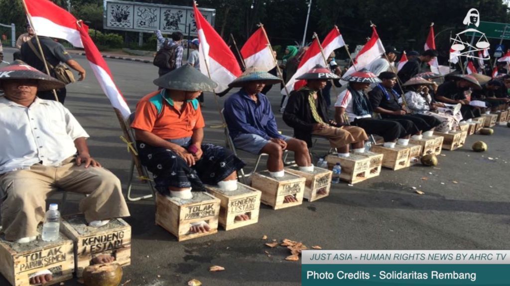 In Indonesia, a group of farmers from Kendeng Mountains, Central Java province cast their feet in cement in front of the Presidential Palace in Jakarta on Tuesday. The farmers are protesting a new environmental permit issued to Semen Indonesia’s cement factories in Rembang, and said they will not shed their cement shackles until President Widodo revokes the permit and closes the factories. The Constitutional Court had previously ordered all cement factory activities to be shut down in Rembang, and an environmental study concluded that the Kendeng karst area should be protected and cannot be mined.