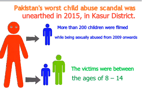 Pakistan’s worst child abuse scandal was unearthed in 2015, in Kasur District. More than 200 children were filmed while being sexually abused from 2009 onwards. And, the latest reported statistics show that 1,974 girls and 1,794 boys have been abused in Pakistan in 2015.