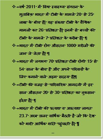 अंकल, आप तो जानते ही हैं कि कुप¨षण और टीबी का गहरा रिश्ता है। और यह सेल मेडिकेटेड इम्यूनिटी को प्रभावित करता है, जिसकी टीबी से निपटने में महत्वपूर्ण भूमिका है। हम जैसे जो कुपोषित बच्चे हैं उन्हें टी.बी. होने का जोखिम कई गुना बढ़ जाता है। अंततः मुझे भी टीबी हो गई। वैसे मध्यप्रदेश में अप्रैल 2013 से ही प्रत्येक कुपोषित बच्चे की टी.बी. की जांच शुरू की गई है। अभी भी इस कठिन काम की जांच के पुराने ही तरीके चल रहे हैं। विदेशों  में कोई जीन एक्सपर्ट नाम की जांच चलती है लेकिन हमारे यहां इसे अभी तक वह लागू नहीं किया है।