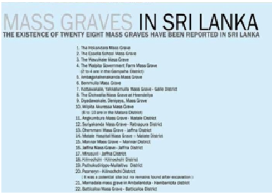 Sri Lanka is a place where very many mass graves have been discovered as shown in the illustration which mentions 22 sites where mass graves have been discovered. Since the publication of this map, few more places have been added to this list.