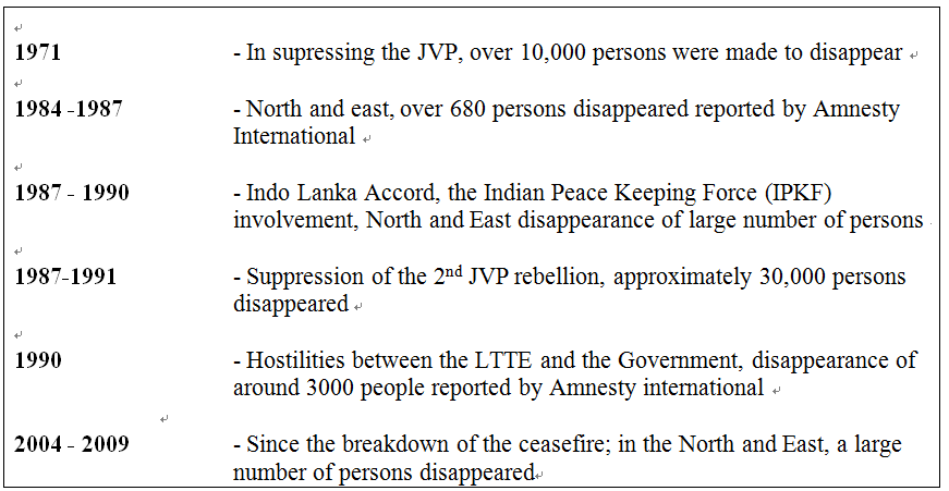 There were many occasions at which large scale disappearances took place in Sri Lanka, a rough sketch of such disappearances is indicated in the box given below: for more details please see Phenomenon of disappearances in Sri Lanka by Mr M C M Iqbal.