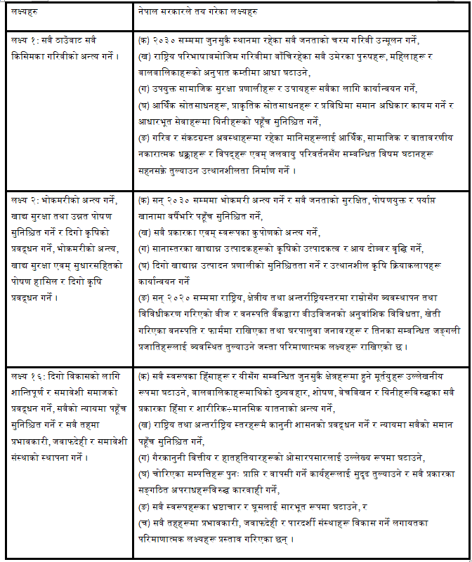 तालिका २: दिगो विकास लक्ष्य (१,२ र १६) सँग सम्बन्धित नेपाल सरकारका लक्ष्यहरु