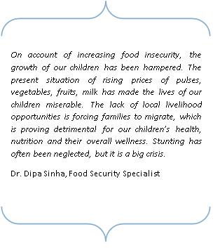 According to Ms. Deepika Sharma of UNICEF, frequent illness and non-availability of proper and adequate nutritious food is the immediate cause of malnutrition in children. Now is the time for us to ensure the right of safe, potable water along with eradicating the root, underlying causes of malnutrition. These causes are child marriage, child labour, caste and gender based discrimination, landlessness, lack of livelihood security, and climate change. Without attacking all these problems, we cannot rid our country of malnutrition.