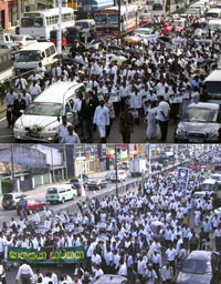 Large crowds gathered to attend the funeral of the well-known journalist and editor, Lasantha Wickramatunga and protest against his assassination. Many participants wore black arm bands and scarves and in many other ways demonstrated their anger at this assassination and other similar incidents that have taken place in the country. At the funeral, speaker after speaker accused the government of this assassination and demanded immediate inquiries and the arrest of the culprits. The Honorable Ambassador for Germany spoke on behalf of the diplomatic community in Colombo and also called on the government for inquiries and prosecution of the offenders. Many media interviews, including those aired by the BBC Sinhala Service, also recorded the same demands for immediate inquiries and the halting of such assassinations.