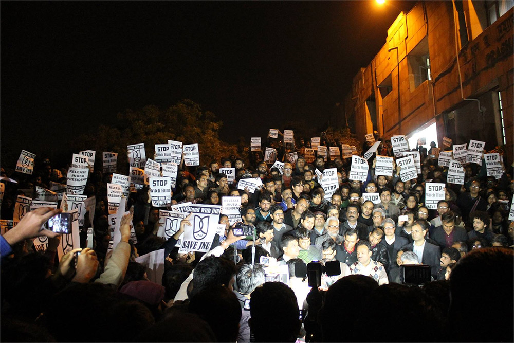 The crackdown on JNU exposes how there is a threat of India being turned into a police state under the current dispensation. A vicious attack on JNU students and faculty has succeeded the crackdown. This incident occurred inside Delhi’s Patiala House Court, by a group of lawyers shouting patriotic slogans under the watch of the police, which refused to intervene. The students and faculty had gone there to show solidarity with Mr. Kumar, who was to be produced in front of a magistrate after the end of his three days’ police remand.