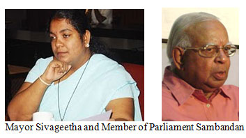 Mayor Sivageetha and MP Sambandan are both political leaders of the Tamils. Mayor Sivageetha, the Mayor of Batticaloa, is in hiding after the presidential election. Speaking from hiding, she has informed the media that her life is seriously threatened as she had openly allied herself with the common opposition candidate Sarath Fonseka in the last election. Now, she is being threatened with death by other Tamil leaders who support the government. It is well-known that in the eastern part of Sri Lanka, the political groups that are close to the government still carry arms and that the practice of assassination and other forms of harm on opponents is common.