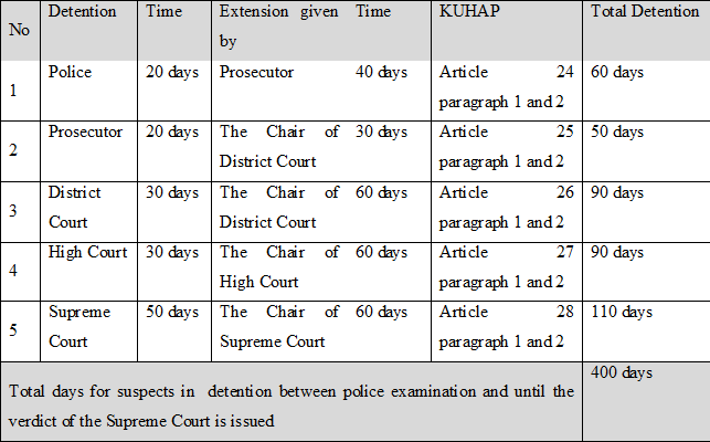 Moreover, Article 29 of the KUHAP provides exception for an extension of the detention period for suspects or defendants. Article 29 paragraph (1) of the Indonesian Law of Criminal Procedure provides an exception to the renewal period of suspects or defendants. It would be those who suffer from severe physical and mental conditions and those suspects or defendants with a penalty of nine years or more. The total extension of the time period that may be granted under the provisions of Article 29 paragraph (1) Criminal Procedure Code is 300 days.