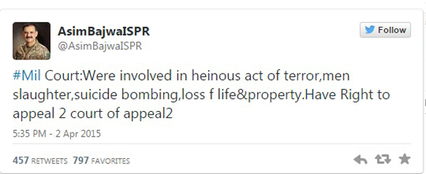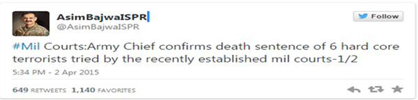The present military courts were established after making an amendment in the constitution, and the Pakistan Army (Amendment) Act, 2015 provides that the military shall now have the jurisdiction to court-martial militants who are “claiming or are known to belong to any terrorist group or organization using the name of religion or a sect”. While the constitutional amendment has allowed the military to take over the function of the judiciary legally, what is the moral basis for military generals with no training in law, to try civilians and sentence them to death? The arbitrary and opaque way in which the death sentence was pronounced to six convicts and life imprisonment to one on April 2 speaks volumes about the fairness and transparency of their trial. The first names and fate of the convicts were only made known via Twitter by the director general of the military’s media wing, Major General Asim Saleem Bajwa.