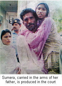 On April 17 though, Sumera was not produced before the court. Station House Officer Mumtaz Sheikh told to the court that Sumeras health prohibited her to come to the court. She was admitted to the PAF Hospital purportedly suffering from a viral infection. But the lawyer informed the court that Sumera had been severely tortured and could not walk, and furthermore that the PAF police were purposely avoiding producing her before the court. The court then ordered that she must be produced within two hours or a FIR would be lodged against the PAF police and the wing commander. In the afternoon Sumera was produced before the court; she was not able to walk and her father had to carry her in his arms. She was not even able to sit. She had been pressured and threatened by the PAF officials to say that she had a throat infection but the judge then asked why she was unable to walk if that was the case.