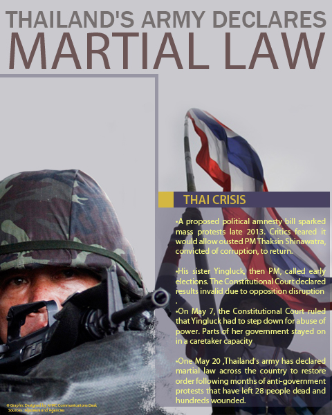 The Asian Human Rights Commission urges all those concerned with human rights in Thailand to carefully monitor the ongoing situation. It also calls on General Prayuth Chan-ocha to immediately provide a justification for why martial law has been imposed, and in the absence of one, to revoke martial law immediately. Furthermore, in the event that the temporary introduction of these measures can be justified, it is beholden on the army to clarify how human rights will be protected under martial law, as well as to provide a timeline for the revocation of the measure and a return to rule under the constitution.