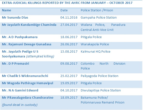 The table given below sets down 09 extrajudicial killings, 01 attempted killing – 09 of which are at the hands of the police at various police stations and the other, in a prison. These 10 incidents are the ones reported to the Asian Human Rights Commission based in Hong Kong during this year. However, at this stage we are unable to state how many more such killings may have taken place.