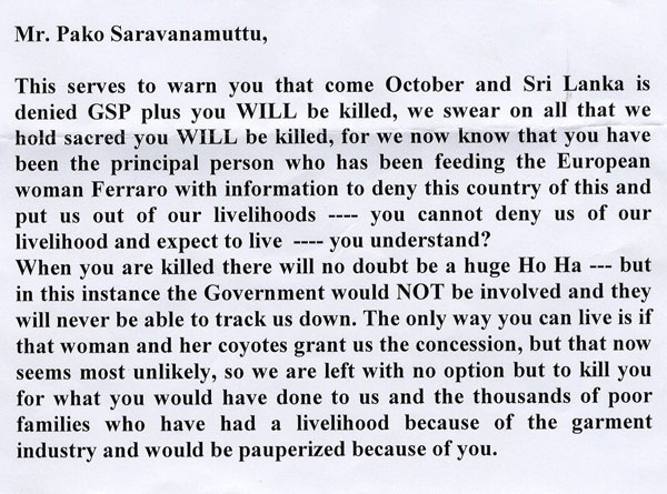 The President of Sri Lanka is reported to have instructed the Defense Secretary to verify the facts stated in a newspaper advertised petition published in several papers, signed by 133 persons condemning the death threat to Dr. P. Saravanamuttu who has received the threat by way of a letter that he would be killed if Sri Lanka does not get the GSP+. (Kindly see the advertisement and the copy of the death threat reproduced below).