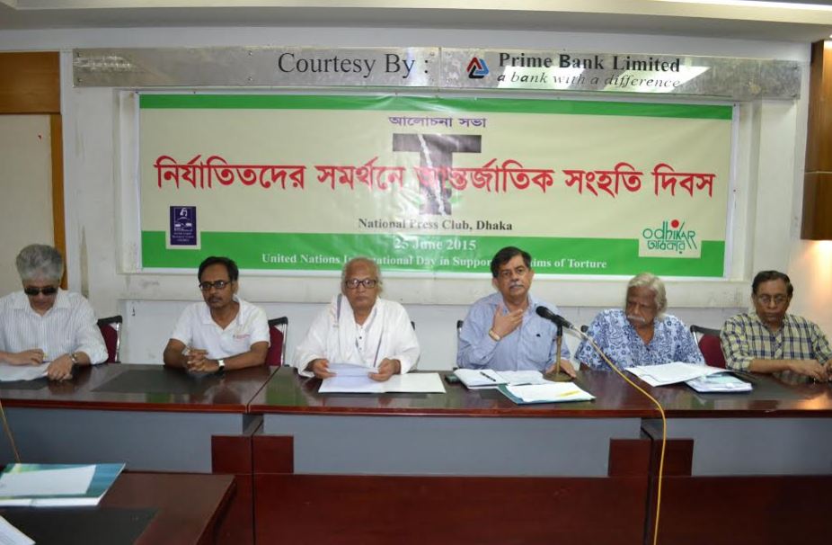 The victims of torture and their families joined the human rights defenders to raise their voice against torture perpetrated by the law-enforcement agencies of Bangladesh. Prominent human rights defenders, academic scholars, jurists and victims of torture participated in a discussion at the National Press Club in Dhaka on 25 June. Amongst others, Human Rights Advocate Adilur Rahman Khan, Rights Activist Mohammad Nur Khan, Right Livelihood Award Laureate Dr. Zafrullah Chowdhury, Poet and writer Farhad Mazhar, Supreme Court lawyer Z. I. Khan Panna, Dhaka University Law Professor Dr. Asif Nazrul, politicians Faizul Hakim Lala and Saiful Haq, and UNDP Human Rights Adviser Mika Kanervavouri spoke in the meeting. Odhikar’s Chairperson, Professor C. R. Abrar, presided over the meeting.