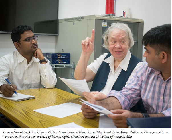 As an editor at the Asian Human Rights Commission in Hong Kong, Maryknoll Sister Marya Zaborowski confers with co-workers as they raise awareness of human rights violations and assist victims of abuse in Asia. Please help the Maryknoll Sisters make God’s love visible by defending the rights of downtrodden people.