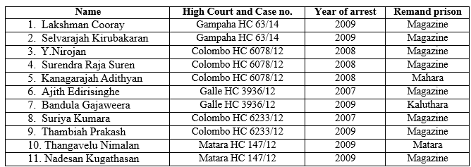 Earlier this year, Kulathunga Hettiarchchige Malcom Tiron (prisoner no. 5329) was released due to lack of evidence, after about 13 years in detention (arrested in 2008) and a trial of approximately 9 years (indicted in 2012). There have been other reports of persons being released as not guilty after upto 15 years in detention1. We note that the provision in the PTA that allows for bail with consent of the Attorney General is rarely being used, and this could at least reduce the terrible consequences prolonged detention has on those who turn out to not guilty. We attach herewith a list of 11 PTA detainees whose details have been provided to us. All of them have been in detention for approximately 12-14 years, and trials are ongoing for approximately 7-9 years.