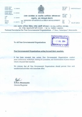 The communication of the Director of National Secretariat for NGOs is an indication of the limited understanding of powerful Sri Lankan defense establishment on the civil liberties. The conduct of the MoD in issuing such communication further strengthens the allegation that Sri Lanka has now become an Authoritarian State.
