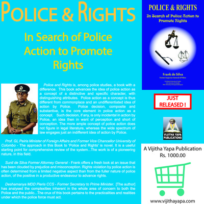 The Asian Human Rights Commission (AHRC) wishes to forward to you the following flyer on the occasion of releasing a new book on the police and rights authored by Frank de Silva, a former Inspector General of Police in Sri Lanka.