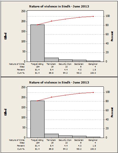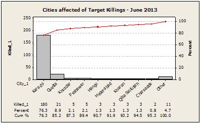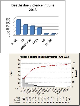 Karachi, the largest commercial city of the country that inhabits people from all provinces, reflects a very scary scenario because of rampant crime of various nature. (See graph 6 below) that endanger human lives. Target killing is the most common form of violence in the city that caused the highest number of death each month.   Karachi alone lost 180 persons due to target killings while Hyderabad lost 2 persons and Larkana 2. Most of the victims of target killings in Karachi were activists of political and religious groups though some Taliban militants were also reportedly got killed in such incidents. This way Karachi stands out as the worst-hit by target-killings but major cities in Balochistan and KPK, too, have suffered this form of violence against selected targets. (See graph 5 below).  Punjab, Gilgit Baltistan (northern Pakistan), and FATA, however, remained almost unaffected during June.