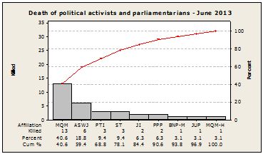 During June, nearly 34 political activists and parliamentarians belonging to different political parties were the victims of target killings and bomb attacks.