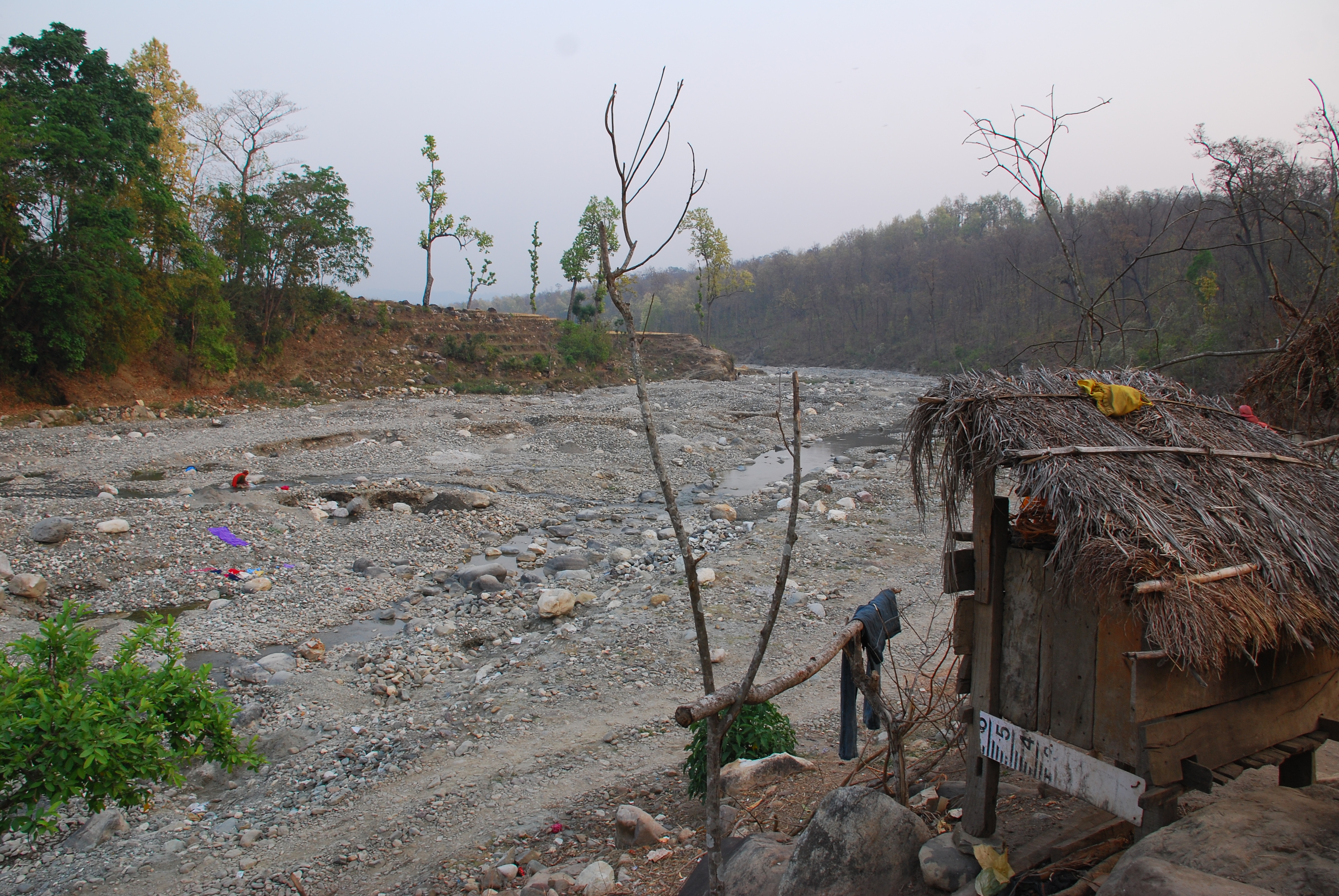 According to the Gandharvas, it takes three days for one family to fill the truck with crushed stones. Generally, women crush the stones and men load them in the truck. Children also contribute their labour. A family is paid 300 Nepali rupees (USD 3.79) for filling the truck, which is equivalent to 100 rupees (USD 1.26) per day. The employer who allegedly owns the land on the other side of the river has been paying this wage, far less than the minimum wage fixed by the government, since the Gandharvas settled in the village. [photo 2] Sand and stones near the riverside