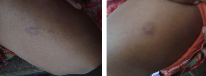 According to the information received, Mr. Uma Kanta Thakur (38) and his family members, who are permanent residents of Janakpur Municipality ward number 13 of Dhanusha District, have been victims of police torture throughout the last year. Uma Kanta is a barber by profession and belongs to Madheshi community. He has been living in Kathmandu Metropolitan city ward number 31 Bagbazar, Kathmandu for 20 years and in a rented room of Mr. Kalyan Khagdi for 15 years with his wife Sunita Devi Thakur (35) and children Mithiles Thakur (15), Rajesh Thakur (13), and Dipika Thakur (8), were also frequently tortured during their visits to the police stations. During this time, they have never had a single dispute with the landlord. (Picture above: close-up of the injuries on the body of Sunita Devi Thakur due to torture).