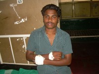 It started to bleed from my palm. Then the Circle Inspector held a pen each between my fingers and started squeezing my palm. I started feeling that my bones will soon crack. I cried out aloud. Then the officer held my fingers between the iron rods in the cell door and bend them with force. At that time, I cried out aloud and pleaded with the officer to murder me instead. The officer then shouted to give him the names of those whom he claimed were with us and held back my thumb by force. I once again cried out. Jenson is a witness to all this. At about 9am three of our friends, Mr. Deepak, Mr. Aji Francis and Mr. Abdul Khadar came to the police station and brought us food. The police still did not inform us what they were suspecting us for or why they were torturing us. Till 8.30pm the police kept us in the cell and did not hurt us any further. Then before 9pm, the police took us to the residence of the local Magistrate. The Magistrate released us on bail on a condition that we must report at the police station on every Monday, Wednesday and Saturday till March 26. Then we returned home.