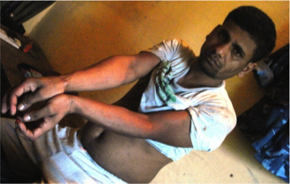 While pouring water into his nose and mouth they beat him hard twice with a stick; there is a small wound on his right knee as a result. They also beat him 4-5 times below his right kneecap. Another mark from this beating resulted. As they hung him, handcuffing his hands and legs, his skin was injured and his wrists were bruised blue. Likewise, his left kneecap is wounded too. And, there is a blue mark on his left ankle and blue marks on his left shoulder and arm.