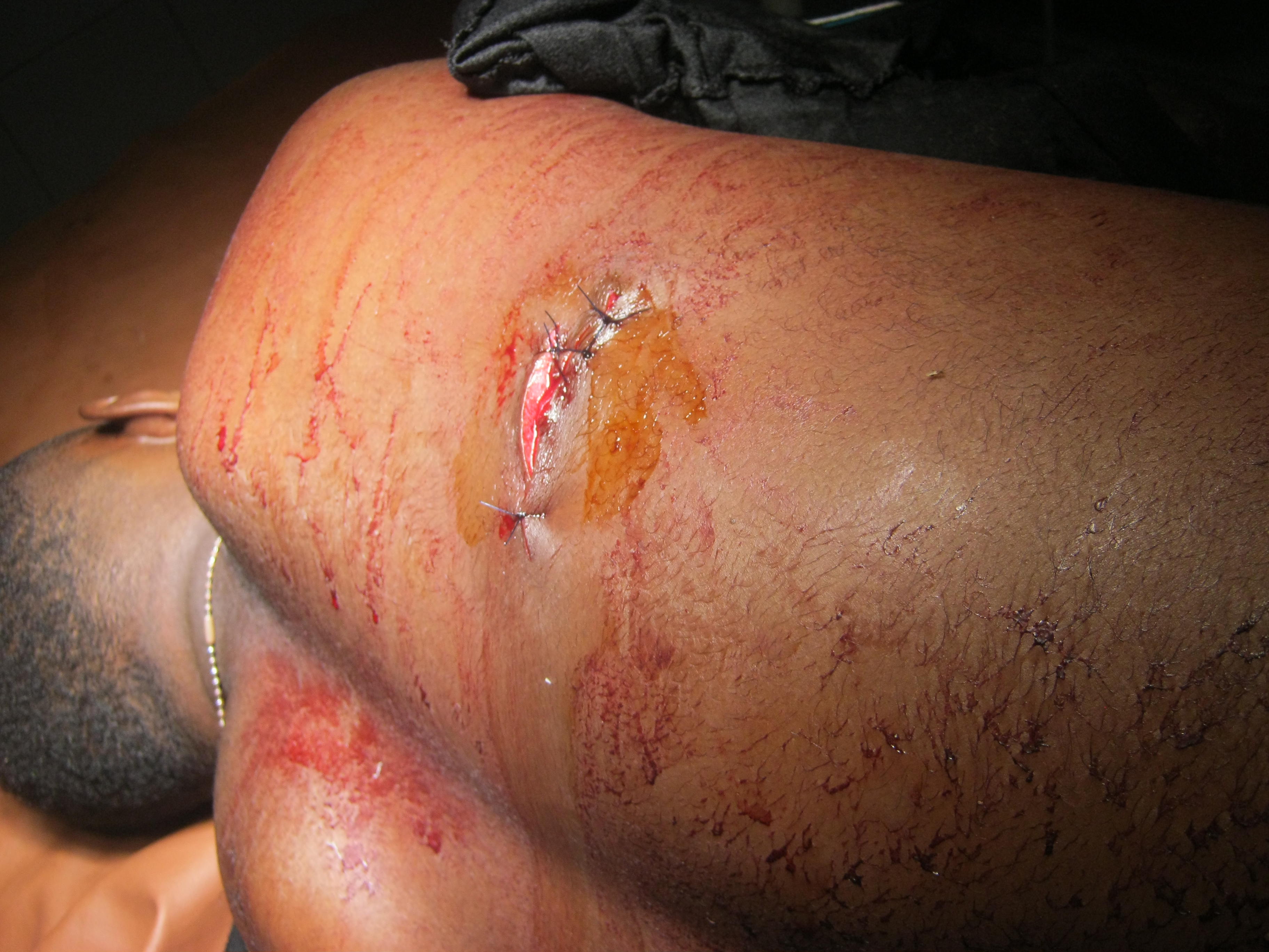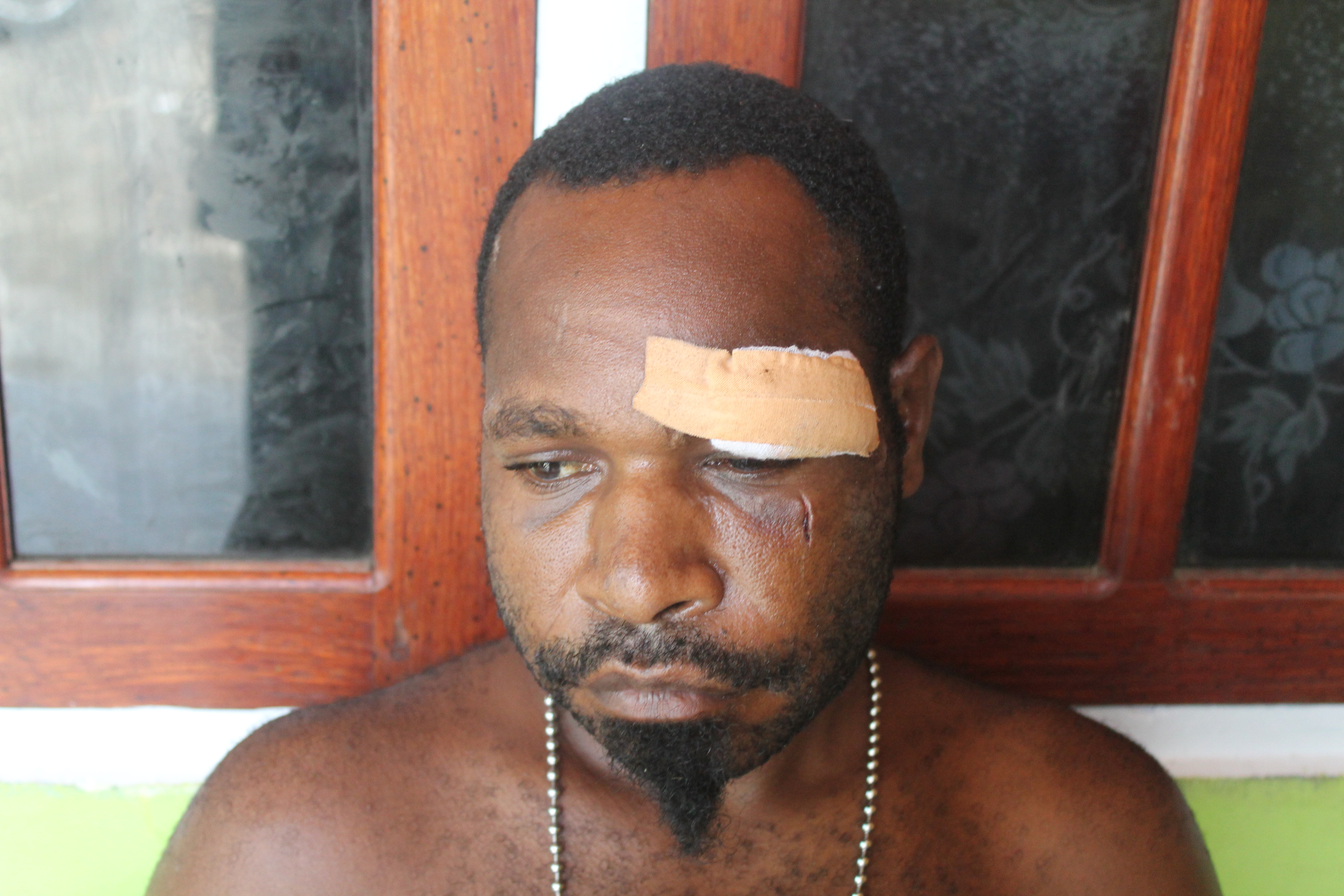 Jery’s brother, Nicolaus Somau, was about to enter the futsal pitch and help his brother. However, he was stabbed in his back by an unidentified officer using a bayonet. He was taken to a hospital by a stranger and received 38 stitches in his back. More police officers later arrived and started shooting. Gilion and Jery were arrested and taken to Nabire District Police. Gilion was put in a dark cell where his left eye brow was stabbed with a bayonet. According to Gilion, the officer was attempting to take his eye ball out but he was prevented by his superior. The officer also attempted to stab Gilion’s head twice yet the attacks were blocked that Gilion suffered two minor cuts in his head and another one in the little finger of his left hand.