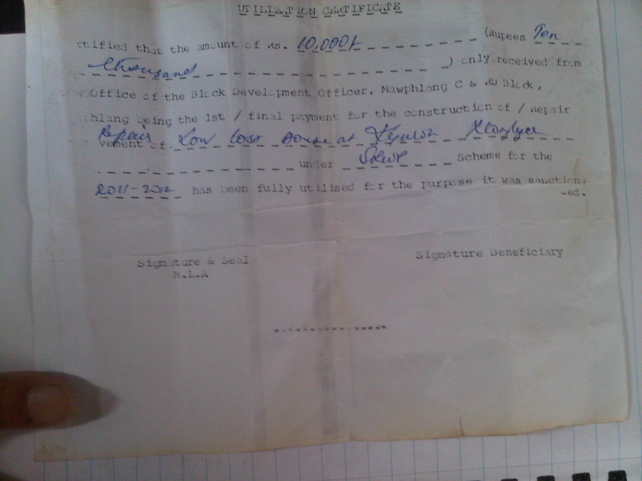 It has also been alleged that women of the village, and their male supporters, have been prevented from using the community utensils that have been purchased with allocations from the local Member of Legislative Assembly (MLA) fund, due to political differences. Excluding a group due to its political affiliation / belief in such a manner is discriminatory. (In the picture: copy of Ms. Martha Mawlong’s application, unsigned by the MLA).