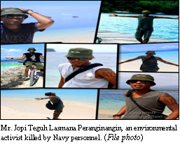 The Asian Human Rights Commission (AHRC) has received information regarding the brutal murder of Mr. Jopi Teguh Lasmana Peranginangin (39), an environmental activist who used to work with the Indigenous People’s Alliance of the Archipelago (AMAN). He was kicked, beaten, and stabbed to death by Indonesian navy personnel on 23 May 2015 at the Venue Bar and Lounge, Jalan Kemang Selatan No. 2, South Jakarta, Indonesia.