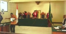 On 12 April 2011, the prosecutor accepted the case file from the Manokwari District Police after the case had already been rejected twice. No reason was given for the sudden acceptance of the case. At the intelligence division office of the public prosecutor, six members of the Manokwari District Police (Gerianto Pabuang, Raden Fidelis, three persons from the intelligence division and one person from the fighter interceptor unit (BUSER)] forced the victims to sign the dossier of the case before transferring it to the prosecutor without legal counsel being present which the victims tried to refuse. After ongoing intimidation from the six Manokwari police personnel, the victims signed the dossier of the case under pressure. On 6 June and 14 June, 2011, five of the victims from the protest march faced their first and second hearings, during which their defence counsel questioned the judicial competence of the court regarding the case. (photo: the trial in Manokwari, source: LP3BH)