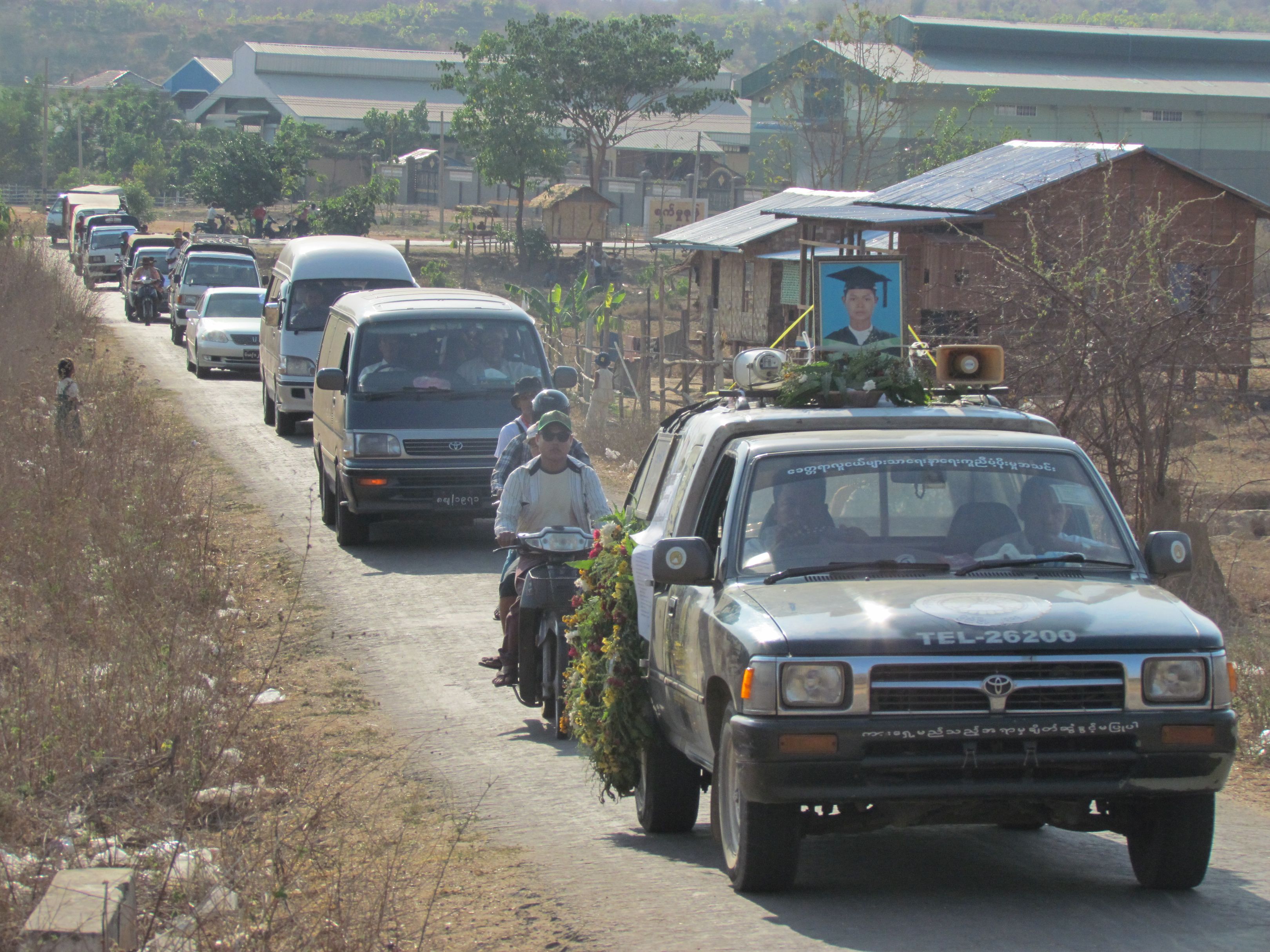 The police then learned that the men were soldiers from the nearby army battalion. Shortly afterwards, Captain Min Thu Aung arrived from the army battalion and removed the three men to the army camp. Subsequently Zaw Min Oo’s battered body was found in the river. (Picture: funeral ceremony for the deceased man).