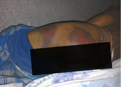 There are still blue marks all over his body, and his whole body swelled up. There is constant bleeding from Ganga Mahato’s anus as a result of the torture.