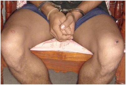 The police handcuffed him and forced his knees between his wrists, inserted a stick through his bent knees and hanged him in the air. After that the police beat him with plastic pipes on his soles, punched him with fists and kicked him with police boots for about 2 hours (Please see photo-1andPhoto-2 here).