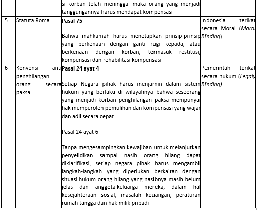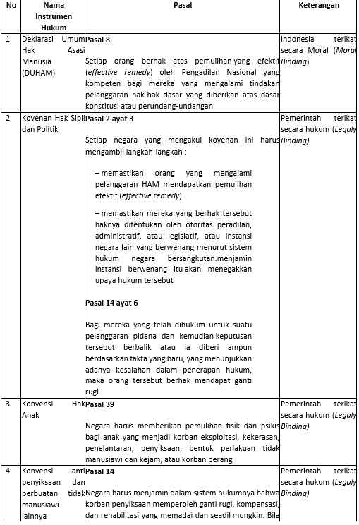 Mekanisme reparasi merupakan bagian tak terpisahkan dari instrumen hukum internasional dan sudah seharusnya praktek di level domestik menyelaraskan dengan setandar internasioanl. Dan berikut adalah beberapa instrumen hukum internasional yang spesifik mengatur reparasi untuk korban pelanggaran hak asasi manusia: